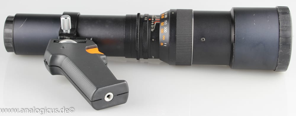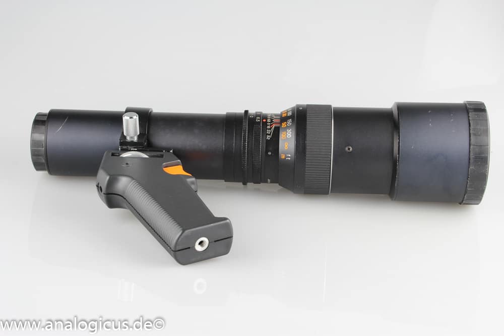 Im Bereich Offenblende ist es zwar nicht besonders scharf das ändert sich aber schon, wenn man auf f/ 8 abblendet. Insgesamt bewerte ich die Optik mit einer Schulnote von 3+. Aufgrund der Länge ist der Einsatz eines Pistolengriffs (siehe Foto) recht hilfreich. Die findet man immer mal wieder in Auktionen zusammen mit alten Kameras. Damit man Objekte scharf bekommt, muss man übrigens schon 6 m entfernt sein…