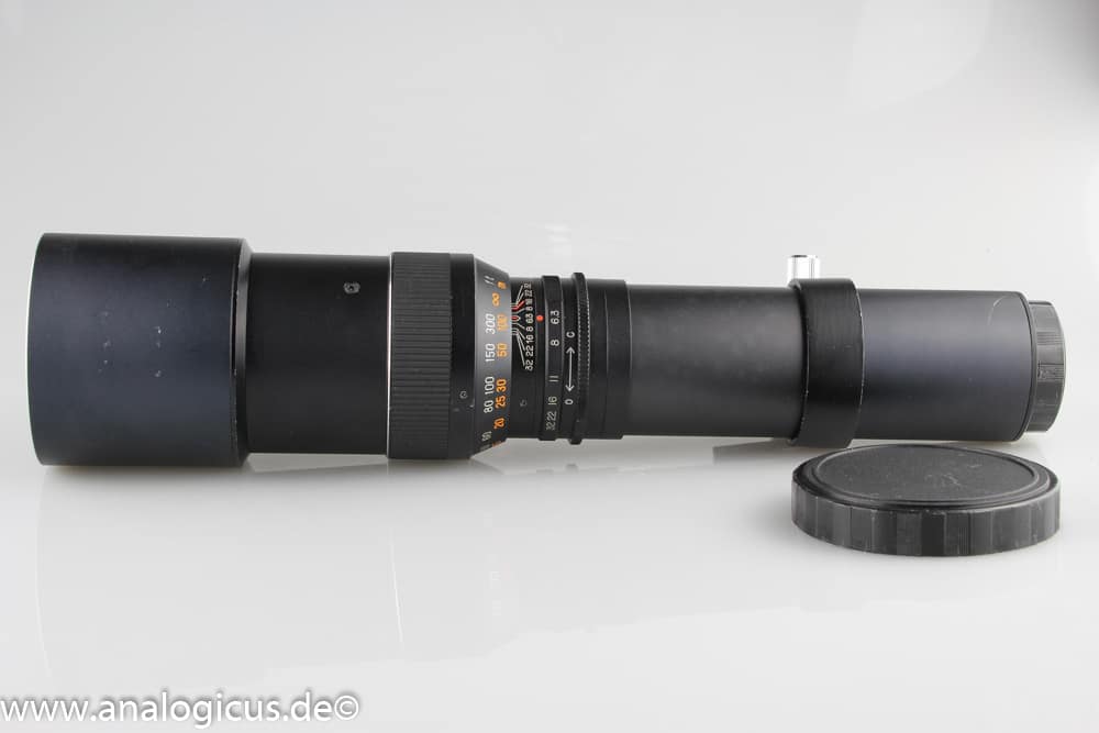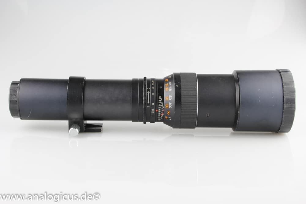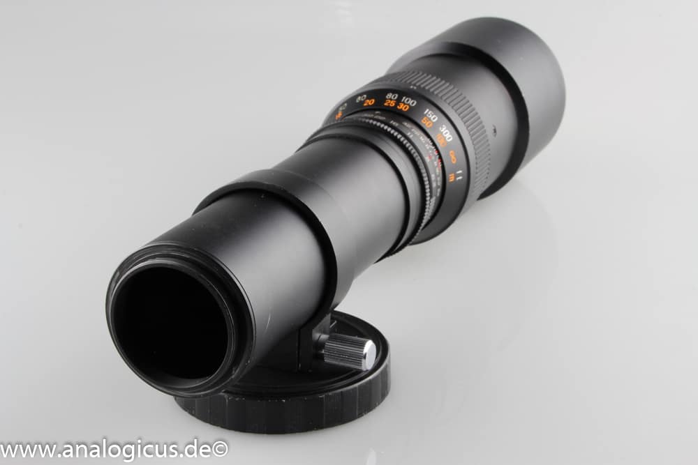 Wenn man dieses Beroflex Objektiv vor sich sieht, erinnert es irgendwie an ein Zielfernrohr für eine Jagdflinte. Es ist verdammt lang! Es hat einen Filterdurchmesser von immerhin 72 mm, was auch die Offenblende von f/6.3 erklärt. Es ist somit lichtstärker als der größere Bruder mit 500 mm und f/8. Bekannt sind diese langen Teleobjektive auch als „Wundertüten“. Damit man es auf dem Stativ ordentlich mit Kamera bestigen kann, verfügt es über eine Stativschelle.