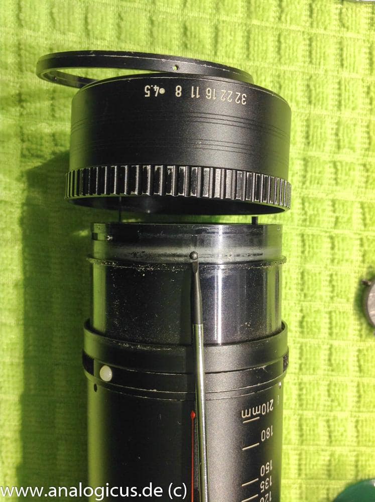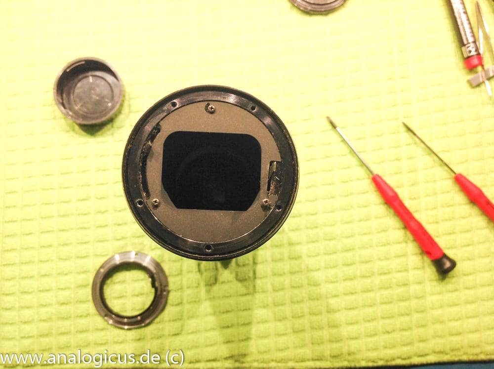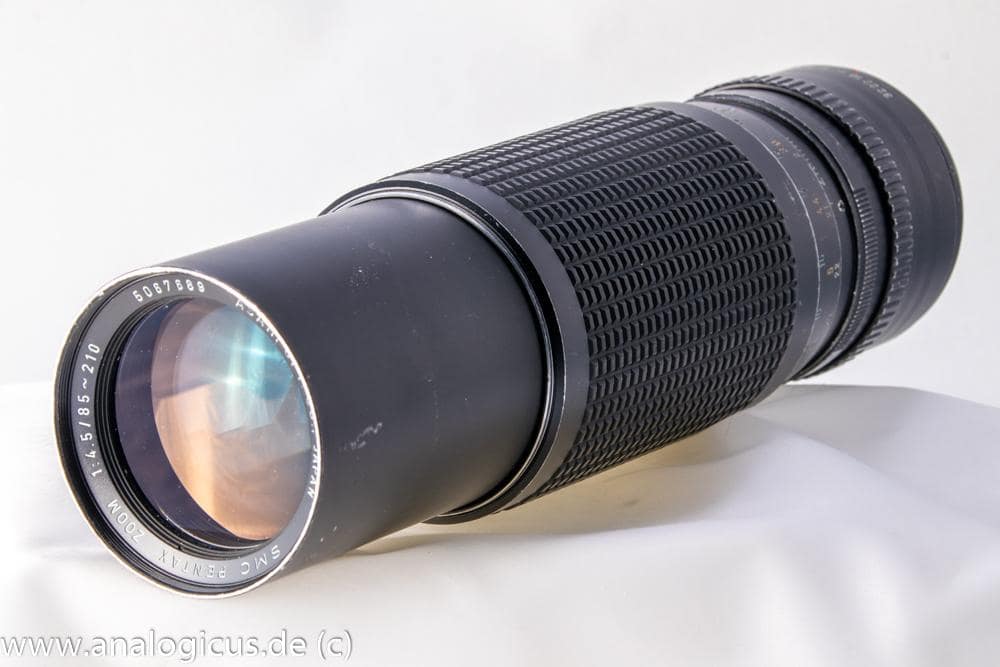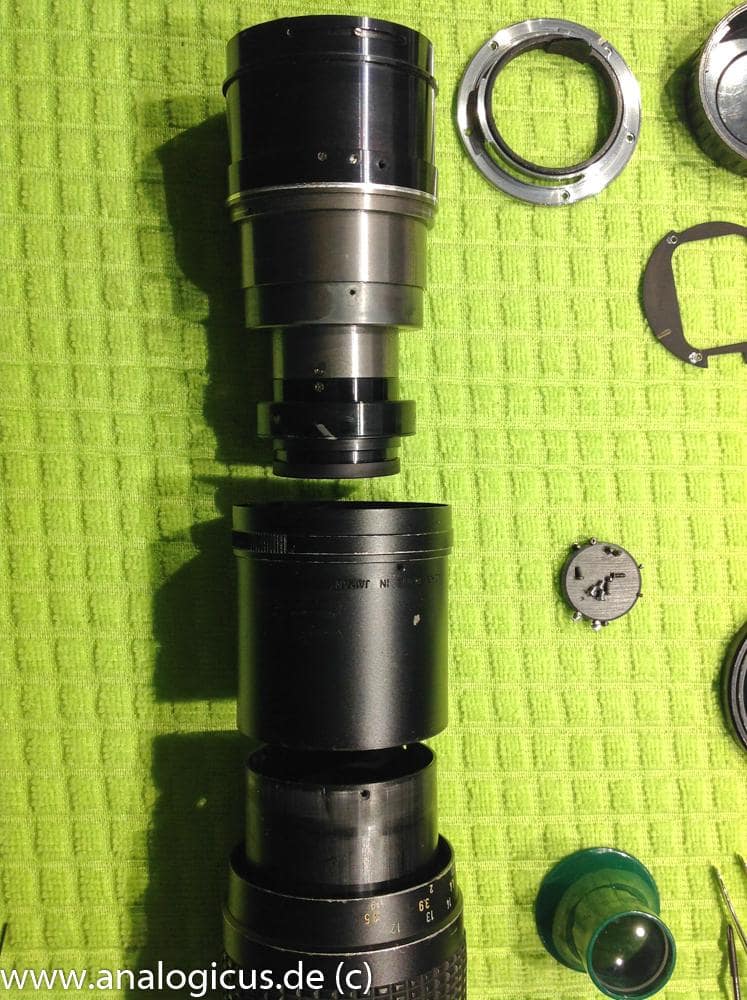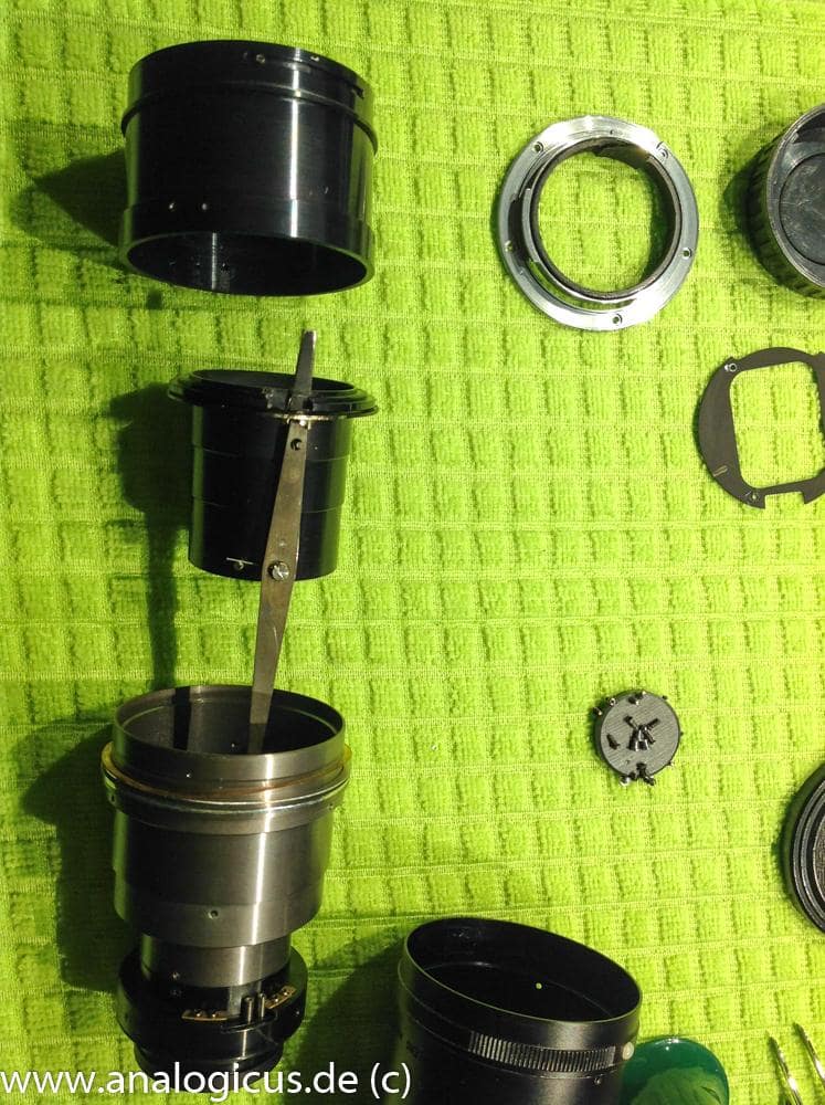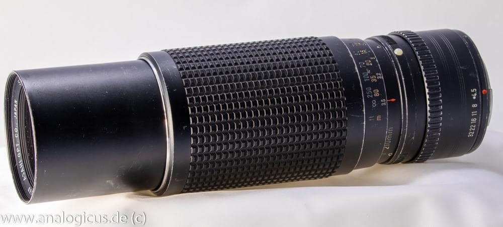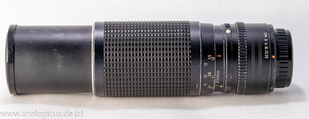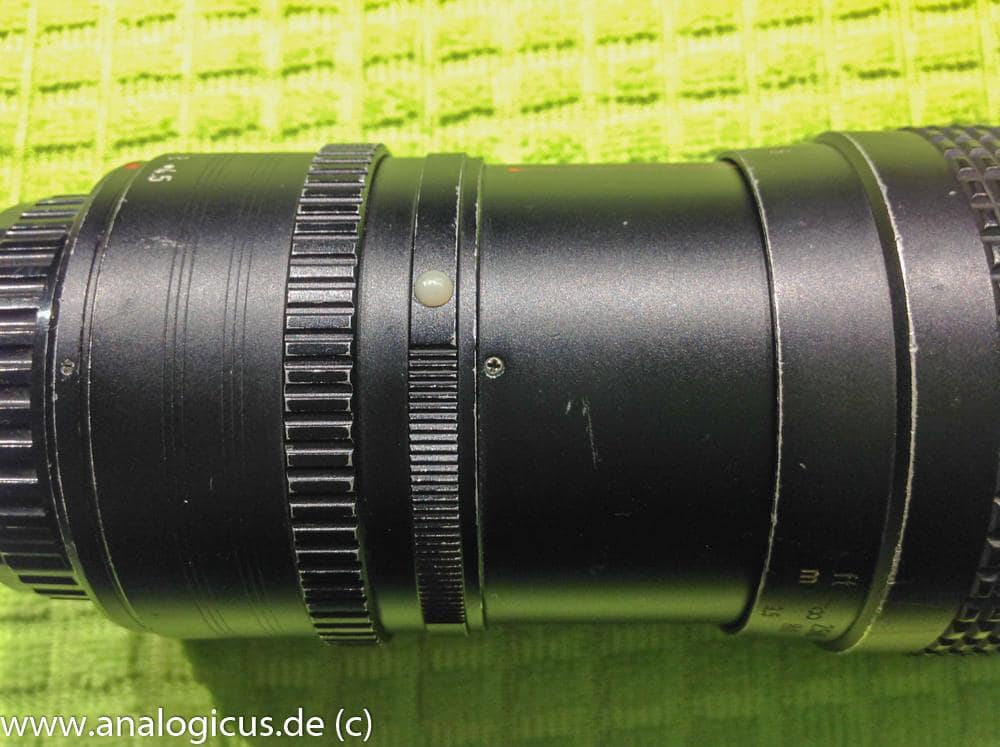 Das Pentax – Schiebezoom ist ganz schön langes Objektiv. Es ist ca. 22 – 23 cm lang. Die Länge bleibt über alle Brennweiten in etwa gleich und es ist für seine Länge auch nicht sonderlich schwer. Das Objektiv besteht vollständig aus Metall und ist solide gebaut. Mein getestetes Modell war leider nicht mehr korrekt zusammen und der Blendenmechanismus funktionierte nicht mehr richtig, daher musste ich diese Fehler zunächst reparieren. Das Objektiv wurde in der Vergangenheit vermutlich häufig genutzt, wie man an den Gebrauchsspuren erkennen kann.