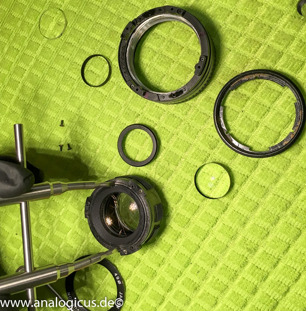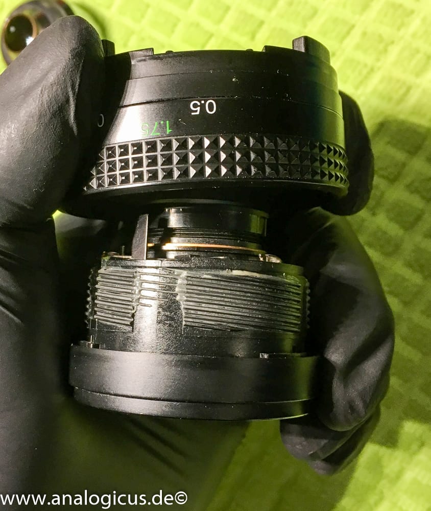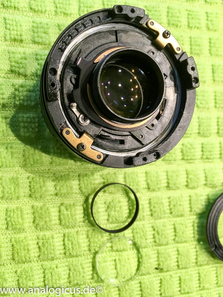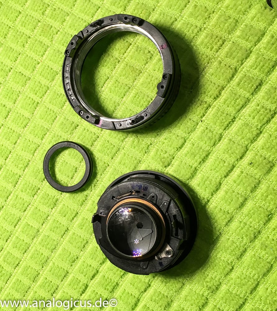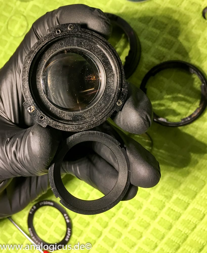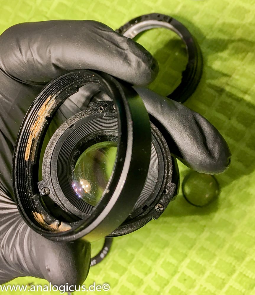 Mein Exemplar hatte unter der Frontlinse sichtbaren Glaspilz, sodass auch hier eine Reingung unumgänglich war. Die übliche Verfahrensweise zum Abdrehen des Beschriftungsrings mittels Gummidichtung schlug leider fehl. Daher hatte ich anschließend zwei kleine Löcher in den Beschriftungsring gebohrt, in der Hoffnung diesen anschließend mittels Objektivtool abdrehen zu können. Da auch diese Lösung nicht zum Erfolg führte, stellte ich bei genauerem Hinsehen fest, dass der Ring einfach nur geklebt war. Schließlich lies sich der Beschriftungsring mit einem kleinen Schraubendreher abhebeln und die vorhandenen Löcher konnte ich mit schwarzem Silikon wieder weitgehend abdichten.