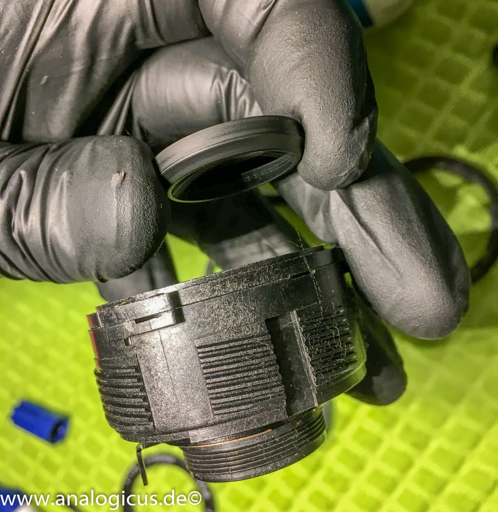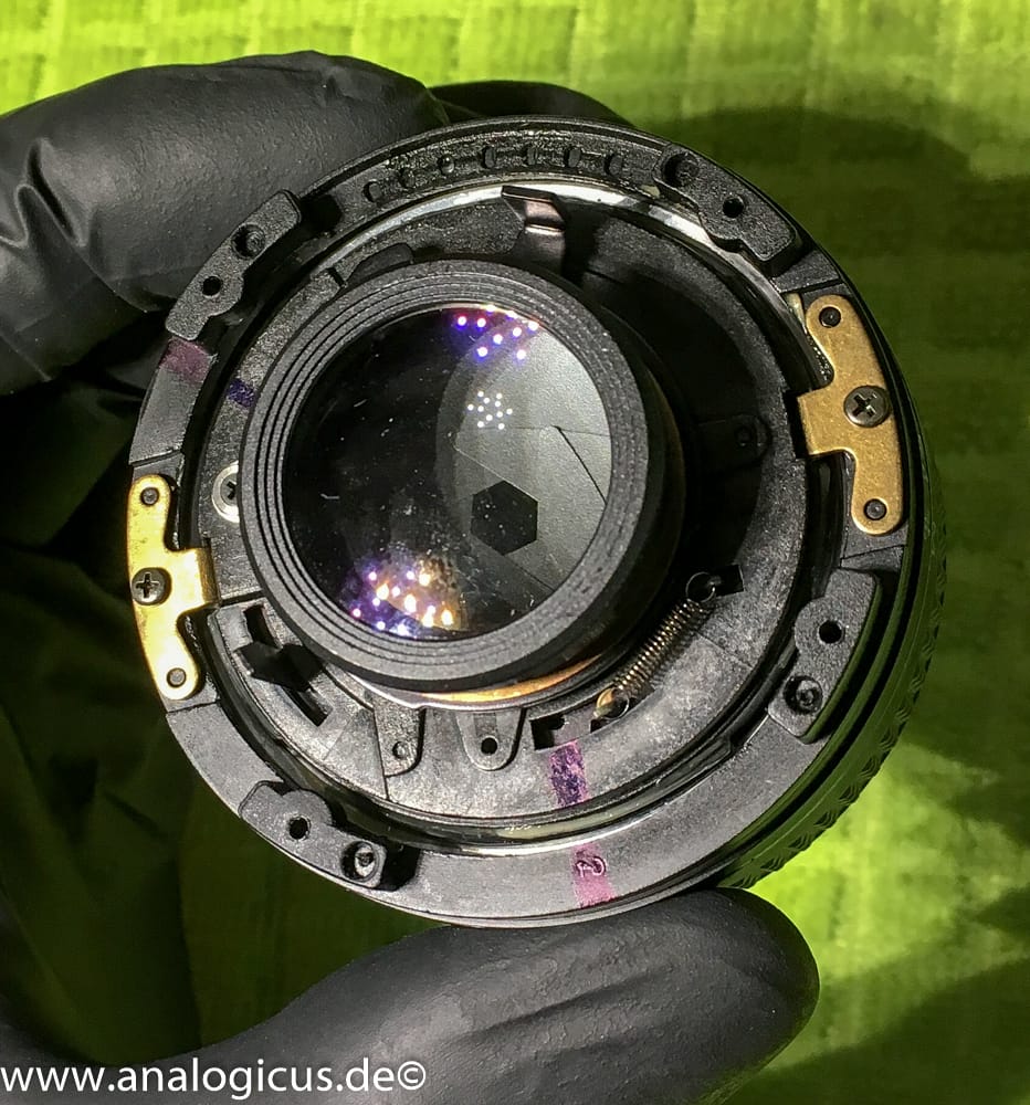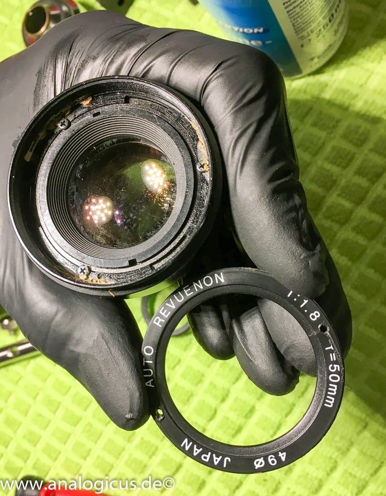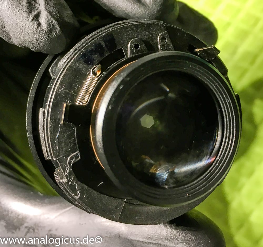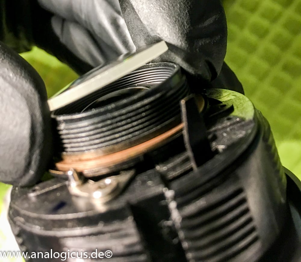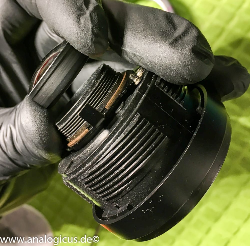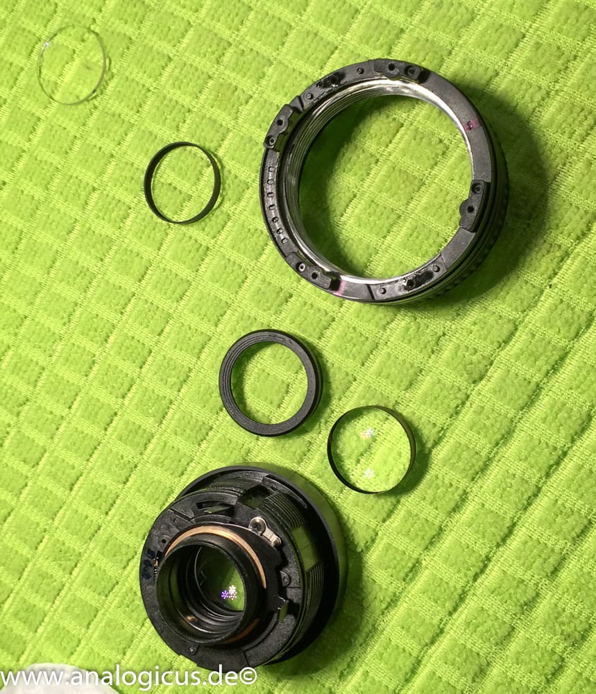 Mein Exemplar hatte unter der Frontlinse sichtbaren Glaspilz, sodass auch hier eine Reingung unumgänglich war. Die übliche Verfahrensweise zum Abdrehen des Beschriftungsrings mittels Gummidichtung schlug leider fehl. Daher hatte ich anschließend zwei kleine Löcher in den Beschriftungsring gebohrt, in der Hoffnung diesen anschließend mittels Objektivtool abdrehen zu können. Da auch diese Lösung nicht zum Erfolg führte, stellte ich bei genauerem Hinsehen fest, dass der Ring einfach nur geklebt war. Schließlich lies sich der Beschriftungsring mit einem kleinen Schraubendreher abhebeln und die vorhandenen Löcher konnte ich mit schwarzem Silikon wieder weitgehend abdichten.