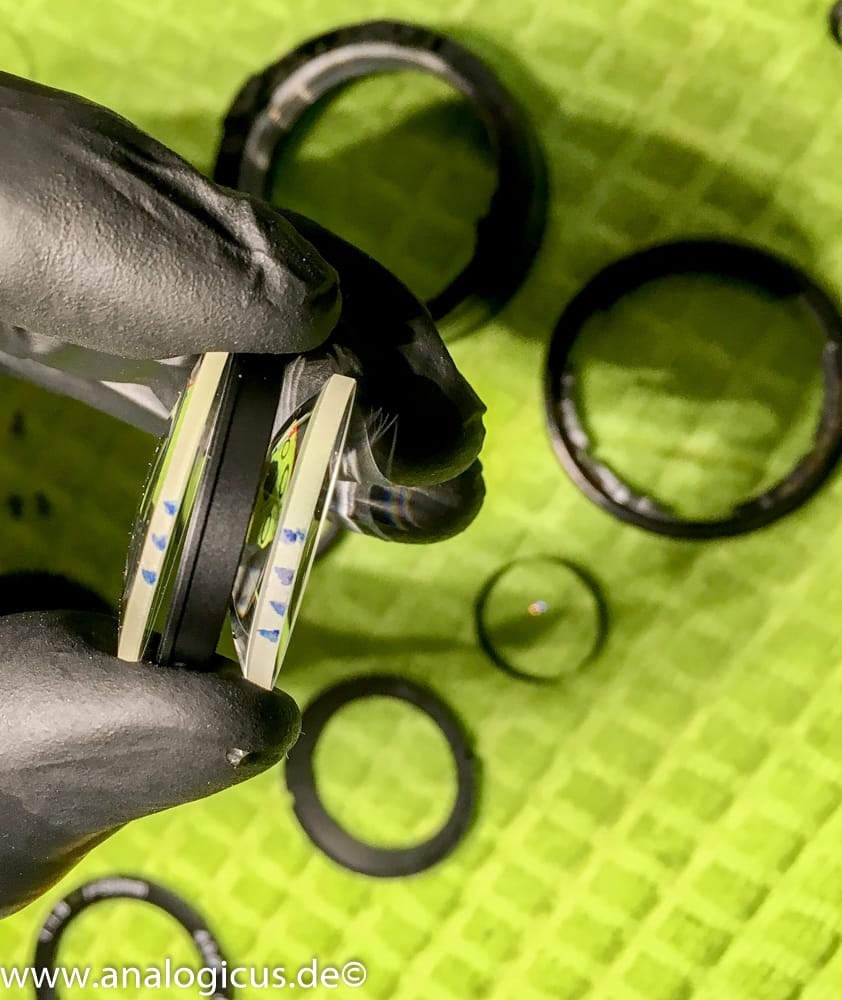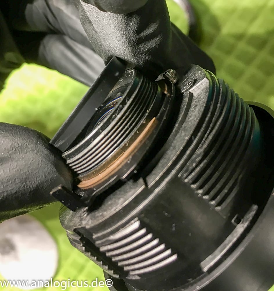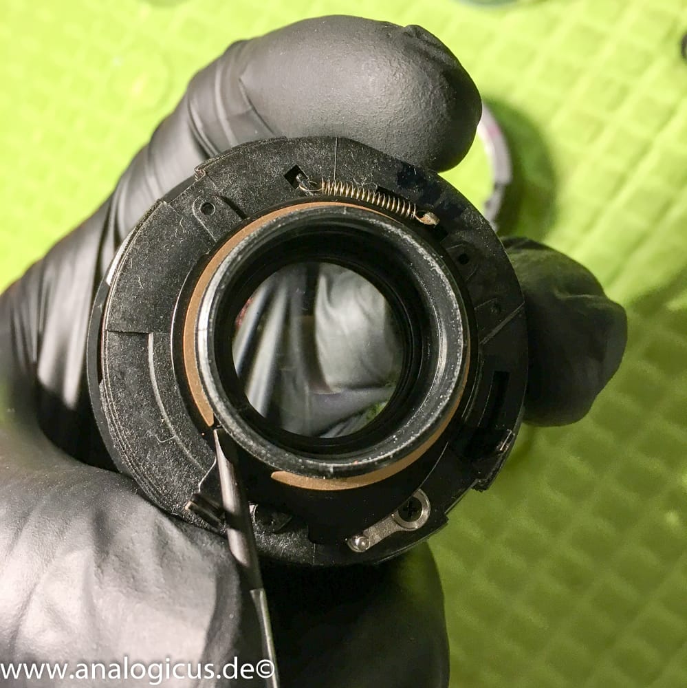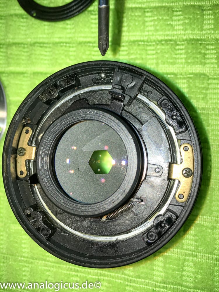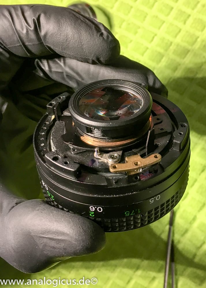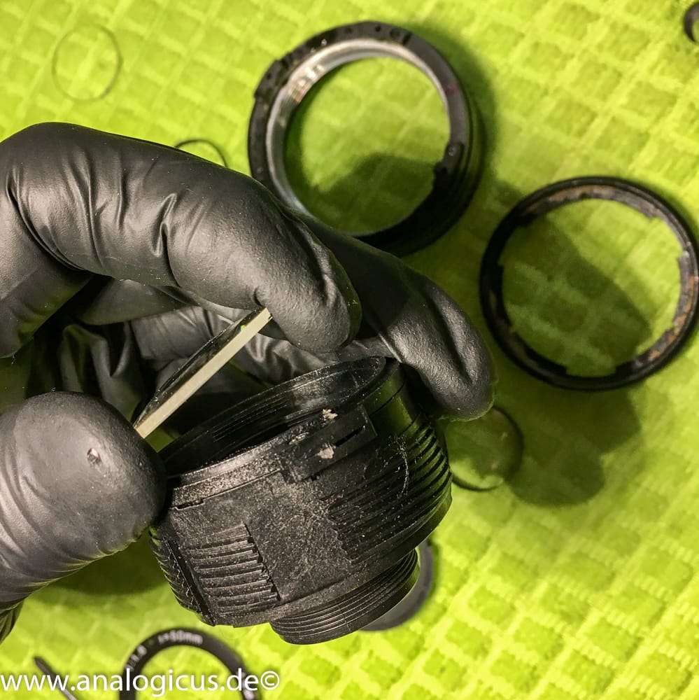 Mein Exemplar hatte unter der Frontlinse sichtbaren Glaspilz, sodass auch hier eine Reingung unumgänglich war. Die übliche Verfahrensweise zum Abdrehen des Beschriftungsrings mittels Gummidichtung schlug leider fehl. Daher hatte ich anschließend zwei kleine Löcher in den Beschriftungsring gebohrt, in der Hoffnung diesen anschließend mittels Objektivtool abdrehen zu können. Da auch diese Lösung nicht zum Erfolg führte, stellte ich bei genauerem Hinsehen fest, dass der Ring einfach nur geklebt war. Schließlich lies sich der Beschriftungsring mit einem kleinen Schraubendreher abhebeln und die vorhandenen Löcher konnte ich mit schwarzem Silikon wieder weitgehend abdichten.