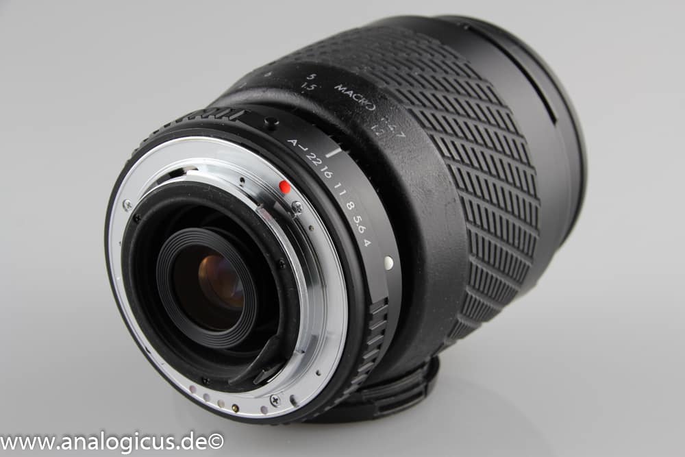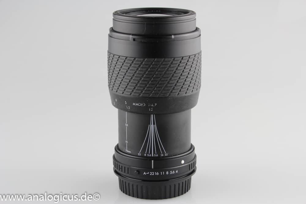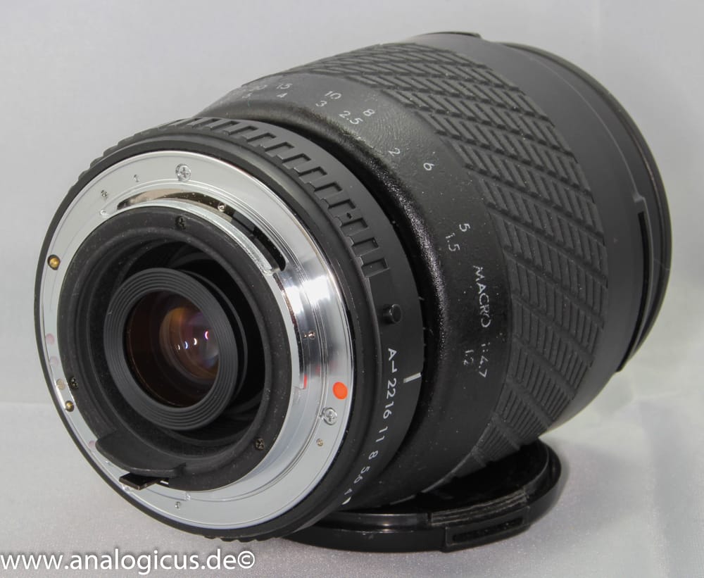 Die manuelle Version des Sigma Objektiv ist hinsichtlich seiner Eigenschaften mit der Autofocus – Version vergleichbar. Auch hier zeigt sich eine etwas klebrige Oberfläche mit hierdurch sogar verwischten Beschriftungen. Das manuelle Schiebezoom ist ebenfalls etwas klapprig und noch etwas schwerer gegenüber der Autofocus-Variante, fährt aber beim Herunterhängen wie dieses auch nicht automatisch aus. Scharfstellung und Zoomvorgang laufen weich und präzise. Insgesamt würde ich die Leistung als befriedigend (Schulnote: 3) bewerten.